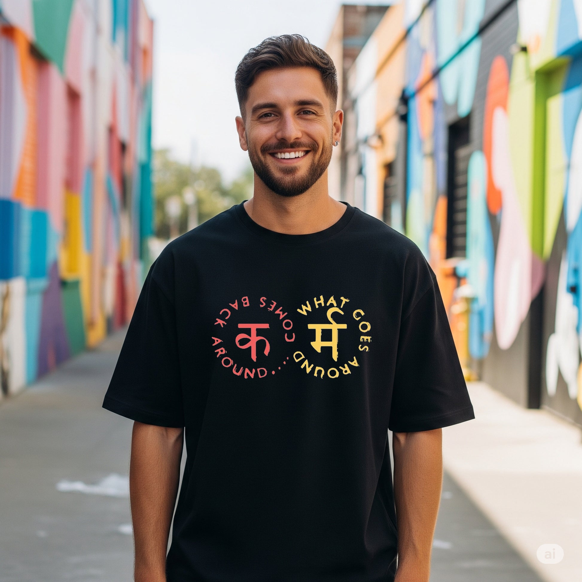 Country of Origin: Proudly Made In India (Assumed, common for Befaltu products) Description: This thought-provoking black Befaltu t-shirt makes a subtle yet powerful statement. The design features a circular graphic with "WHAT GOES AROUND" in yellow and "COMES BACK AROUND" in red, mirroring the Hindi word "कर्म" (Karma) in contrasting colors at the center. Its comfortable oversized fit ensures maximum ease of wear, making it an ideal choice for casual outings, philosophical gatherings, or simply expressing your perspective on life.