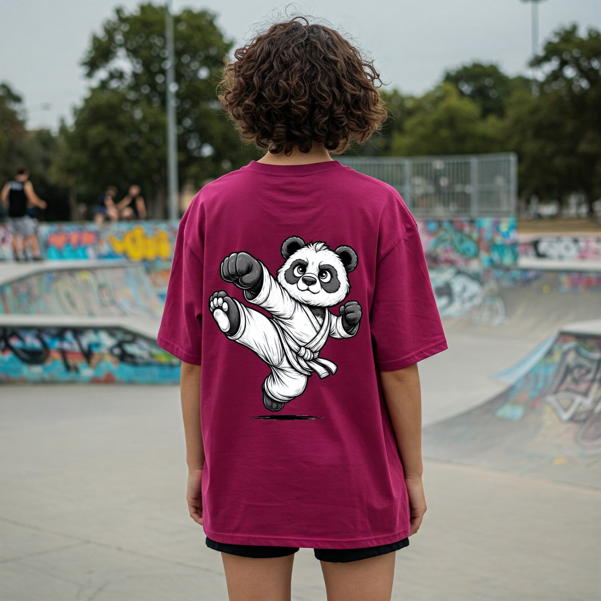 Description: Show off your playful and powerful side with this maroon oversized women's t-shirt from Befaltu. Featuring a cool graphic of a panda practicing karate in a gi, this tee is made from comfortable 180 GSM cotton for a relaxed and stylish fit. Perfect for animal lovers and those who appreciate a fun, unique design.