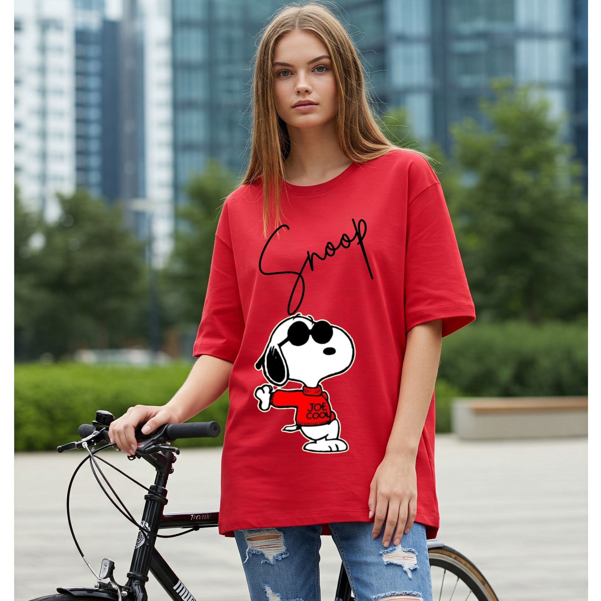 Description: Show off your love for the iconic Peanuts character with this red oversized women's t-shirt from Befaltu. Featuring a fun graphic of Snoopy, this tee is made from comfortable 180 GSM cotton for a relaxed and stylish fit. Perfect for fans of Snoopy and unique graphic tees.